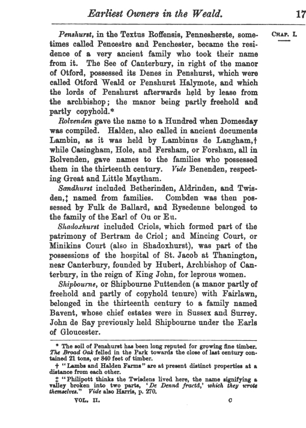 A History of The Weald of Kent with an outline of the History of the County to the present time, Volume II by Robert Furley, F.S.A. published by Henry Igglesden, 94 High Street, Ashford & John Russell Smith, 36 Soho Square, London in 1874